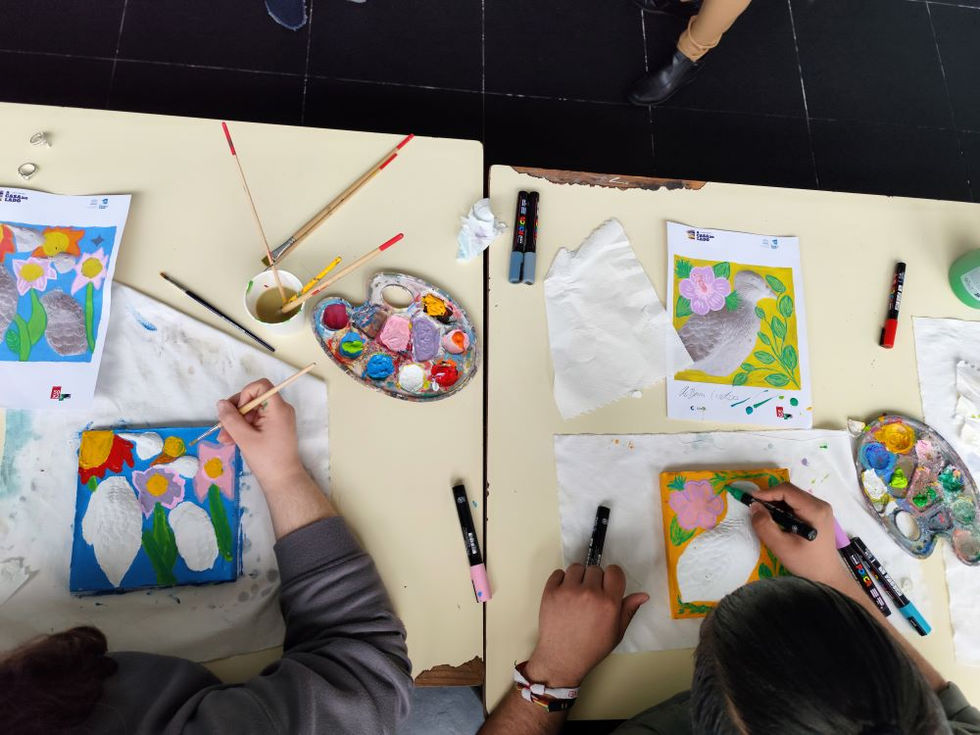 A imagem criada para a pintura mural traduz simbolicamente essas conversas. No centro, uma figura silenciosa, retraída, fechada em si mesma, representação das restrições impostas pela Ditadura. Mas dessa figura ergue-se uma sombra, e nela, uma pomba: símbolo universal da paz e da liberdade. É essa sombra que projeta a esperança, que aponta para a mudança trazida pelo 25 de Abril. A pomba representa o momento em que, finalmente, as pessoas sentiram que podiam falar, partilhar, viver em liberdade.