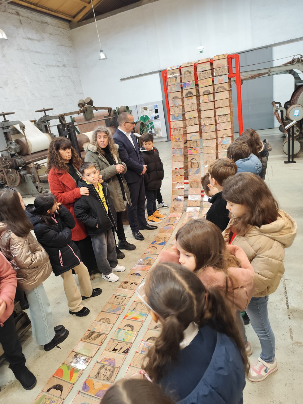 A 3.ª edição do TEAR – Territórios Artísticos assumiu-se como uma homenagem às mulheres trabalhadoras das empresas têxteis do concelho de Vila Nova de Famalicão, reconhecendo o seu papel fundamental na continuidade, evolução e identidade da indústria têxtil local. São elas que, com o seu saber, dedicação e resiliência, sustentam diariamente um setor que continua a crescer e a reinventar-se. Os rostos das mulheres estiveram no centro conceptual desta edição, servindo de ponto de partida para as oficinas artísticas desenvolvidas com as escolas. Através do trabalho de linha e mancha, os alunos exploraram a expressão, a identidade e a memória, transformando cada rosto numa narrativa visual carregada de significado humano e social. Como inspiração técnica e simbólica, o projeto recorreu ao tear Jacquard, marco histórico da indústria têxtil e precursor da criação de padrões através de cartões perfurados. Tal como neste tear pioneiro, onde cada cartão contém uma informação essencial para a construção do desenho final, os trabalhos realizados pelas escolas deram origem a exemplares desses cartões. Cada fragmento — cada traço, cada parte de um rosto — assumiu um valor próprio que, quando unido aos restantes, se transformou num todo coeso. Esta união de partes simboliza o papel coletivo das mulheres na indústria têxtil: cada uma indispensável, cada uma única, mas juntas formando o pilar que sustenta o setor.